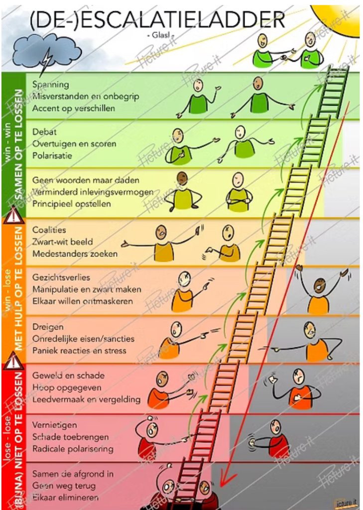 Glasl beschrijft 9 fasen van conflict-escalatie. Hoe hoger je op de ladder komt, hoe moeilijker een conflict op te lossen is.