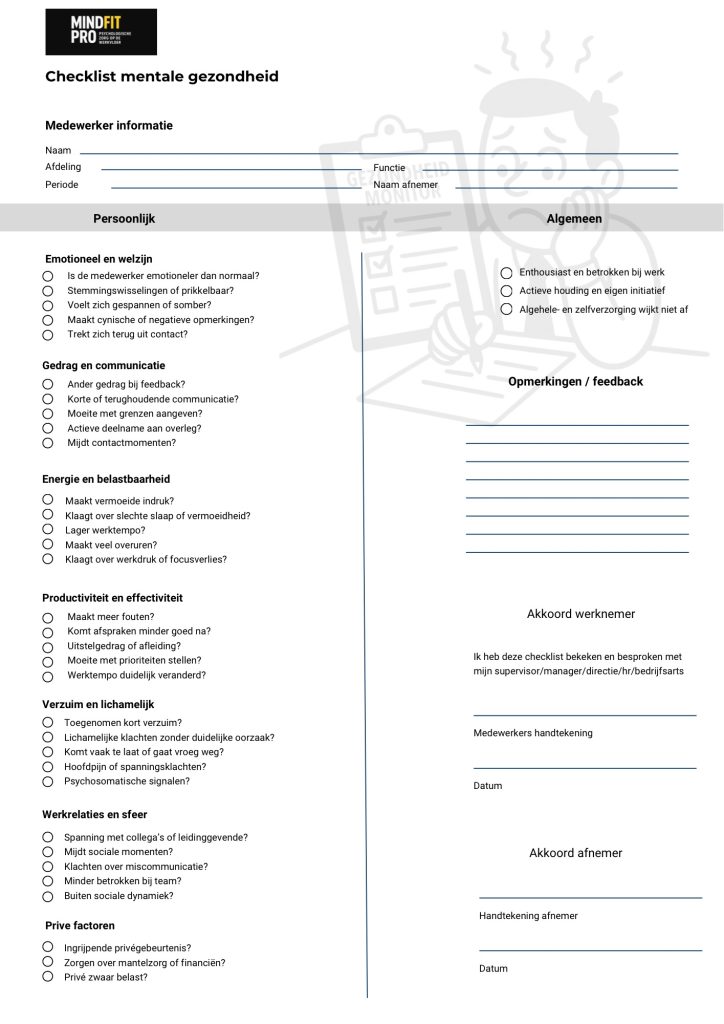 MindFitPro biedt een humoristische, toegankelijke checklist om signalen van mentale overbelasting snel in kaart te brengen.